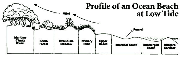 The beach moves from the intertidal graveyard to a desert of loose, shifting sand on the upper beach, where hardly anything grows. It then continues upward to the primary dune where some hardy vegetation begins to take hold. This vegetation must be able to withstand the sandblasting effect of salt spray and wind swept sand. Sea oats, yucca, prickly-pear cactus, sandspurs, beach croton are common inhabitants. Sea oats are the most successful competitor in this environment and are protected by law because of their vital role in building and stabilizing the dunes.
