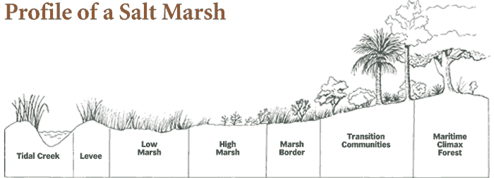 Moving from the harsh environment of the marsh, back toward the maritime forest, a similar transition occurs. A high point occurs which marks the highest normal range for tidal encroachment, and freshwater vegetation begin to take hold. Rains and runoff dilute the salinity to acceptable levels for various flowers, shrubs and small trees to thrive. This vegetation then joins with the maritime forest to complete the barrier island spectrum of life.