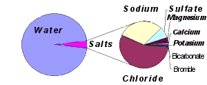 Now, how much salt is in our bodies? About 9ppt or about one fourth the amount in ocean water. What would happen if we were stranded at sea and began to drink salt water to quench our thirst? Well, the water in our cells would drain out of our cells to try to dilute the salt in our bloodstream, through a process of osmosis. The semi-permeable membranes in our cells will only allow certain concentrations of saltiness to pass into our cells, so water drains out of our cells in an attempt to equalize the salinity. That causes us to dehydrate further. Eventually, our brains would be affected, we would go crazy, then die. The Lesson? Don't drink the water!